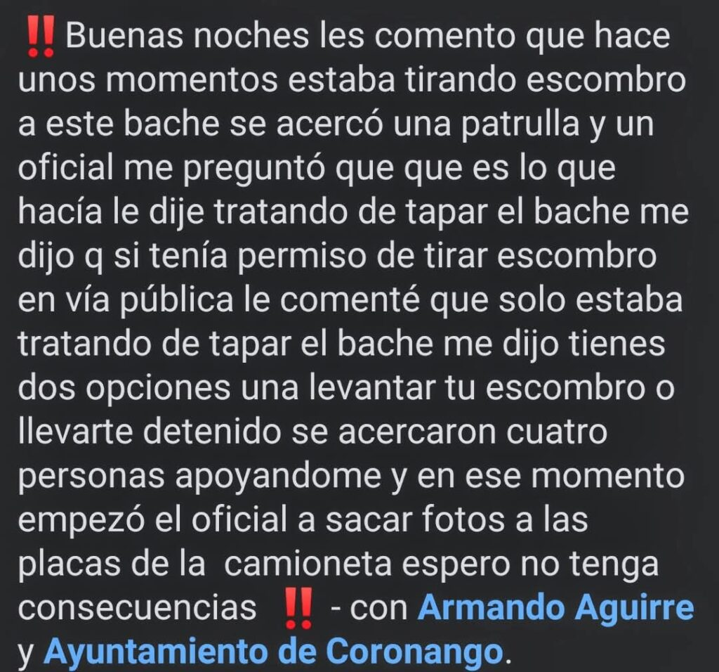 - 🚔 Policías municipales amenazaron con detener a un ciudadano por rellenar un bache.