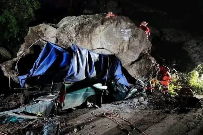 El vehículo quedó completamente aplastado por el impacto de la roca, y ambos murieron de forma instantánea.