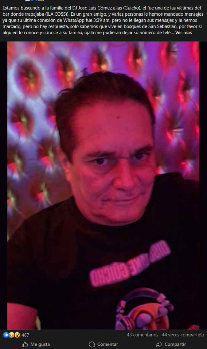 “Estamos buscando a la familia del DJ José Luis Gómez, alias Guicho.