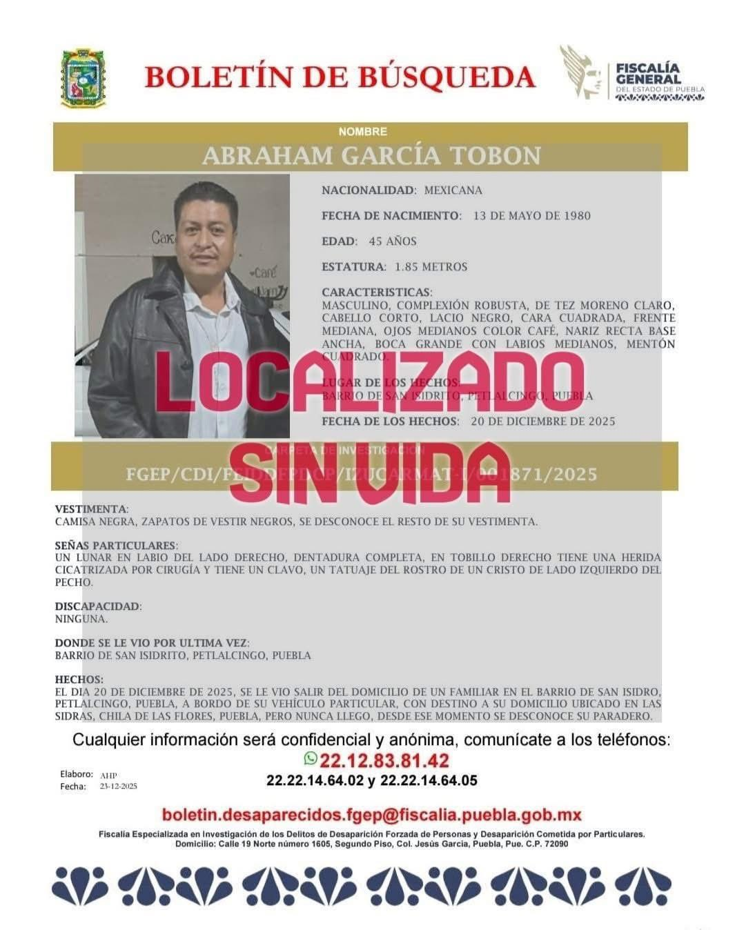 La esperanza que su familia sostuvo durante cuatro días se apagó en silencio. Abraham García Tobón, reportado como desaparecido en el municipio de Petlalcingo, fue localizado sin vida, confirmó este miércoles 24 de diciembre información cercana al caso.