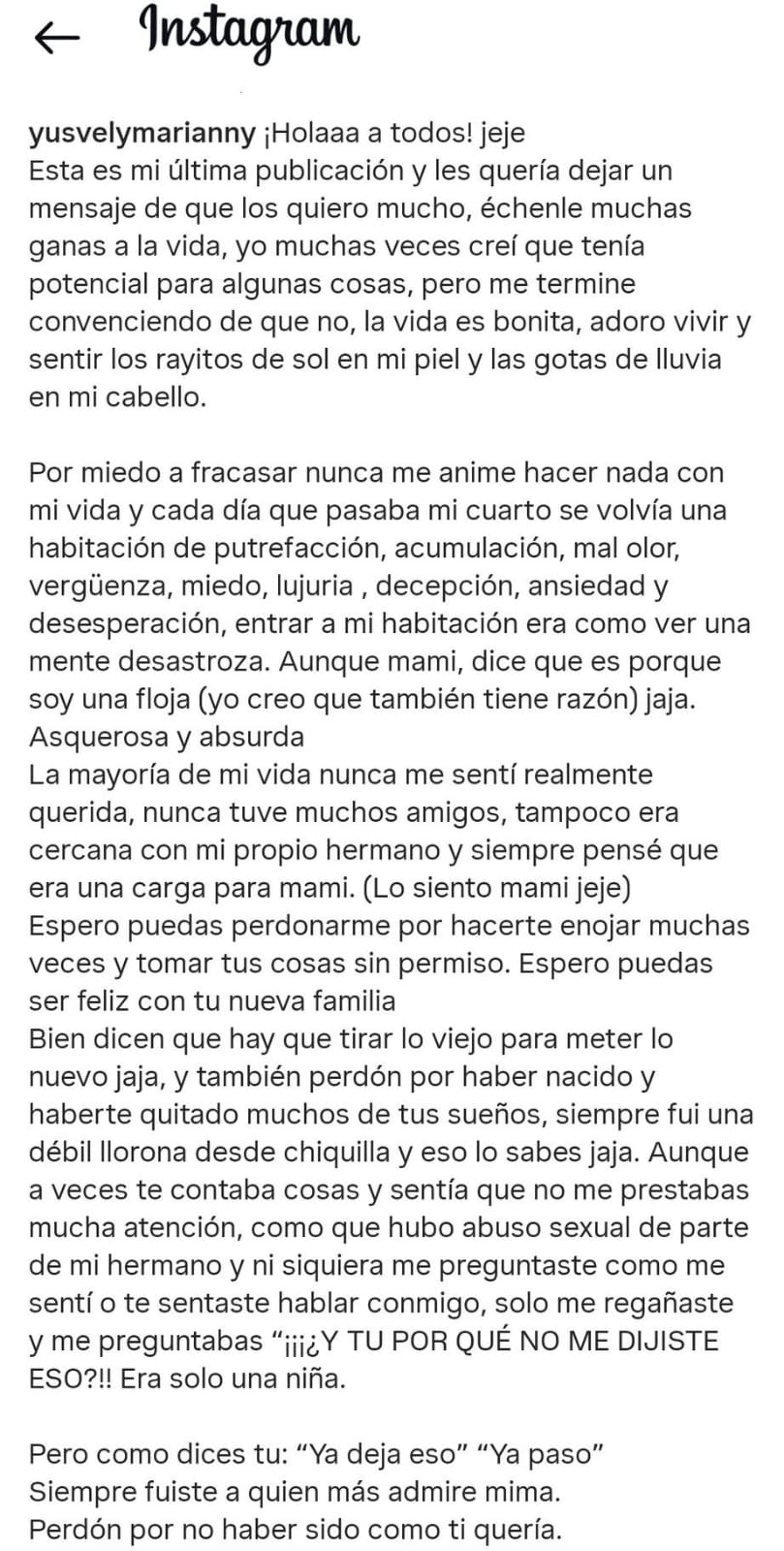Minutos antes de la tragedia, Yusvely publicó un mensaje de despedida en su cuenta de Instagram, donde dejó entrever el profundo dolor que la aquejaba: