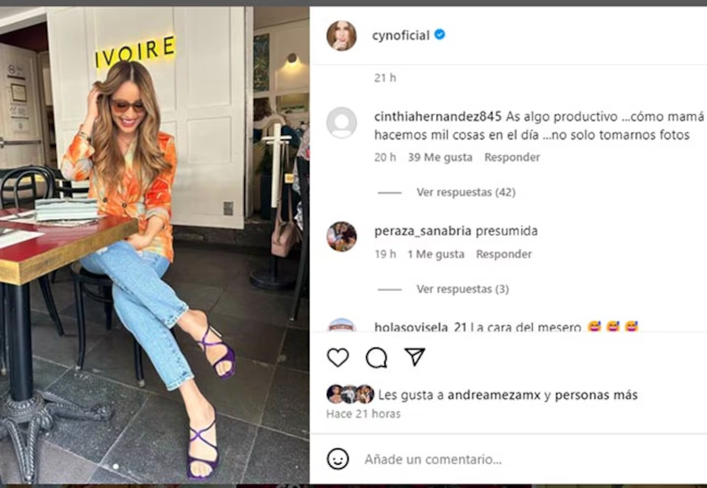 La publicación mostraba a Cynthia relajada en una terraza, aparentemente esperando a sus amigas mientras disfrutaba de un café. “Estaba a punto de ordenar un café… se me había olvidado tomarme foto”, escribió en el pie de foto.