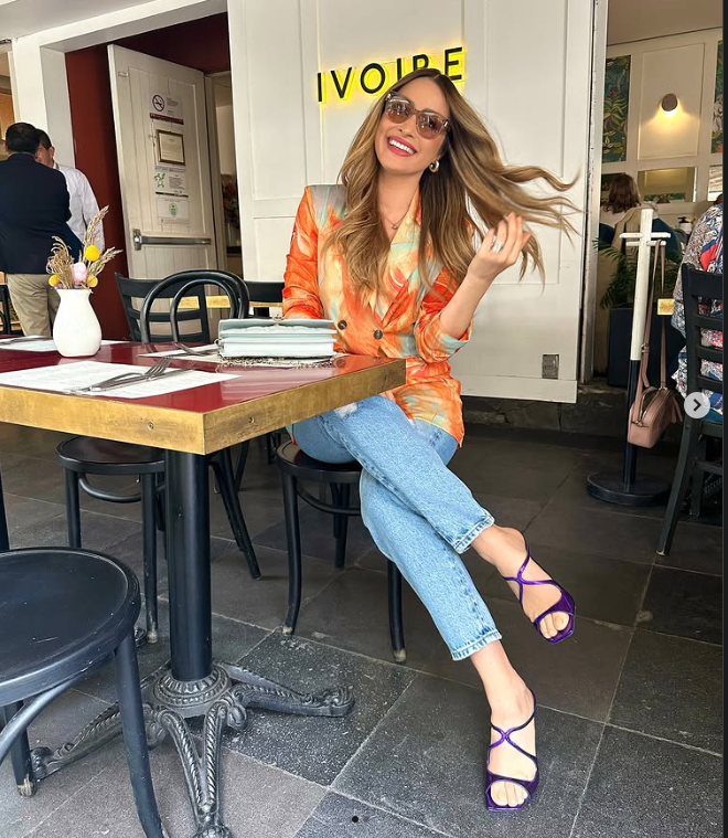 👗 Cynthia se mostró en un restaurante con jeans, blazer naranja y tacones morados.
